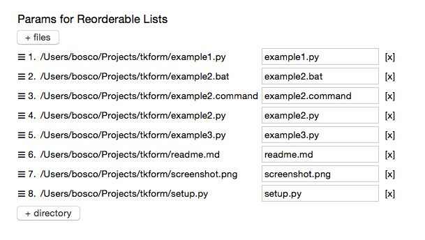 I've even included a reoderable list widget that can display a list of filenames and elements that can be reordered and renamed, before the 'submit' button is pressed. This way your command-line utility can receive a list of filenames, ordered to your end-user's content. Imagine asking your end-user to do that on the command-line?